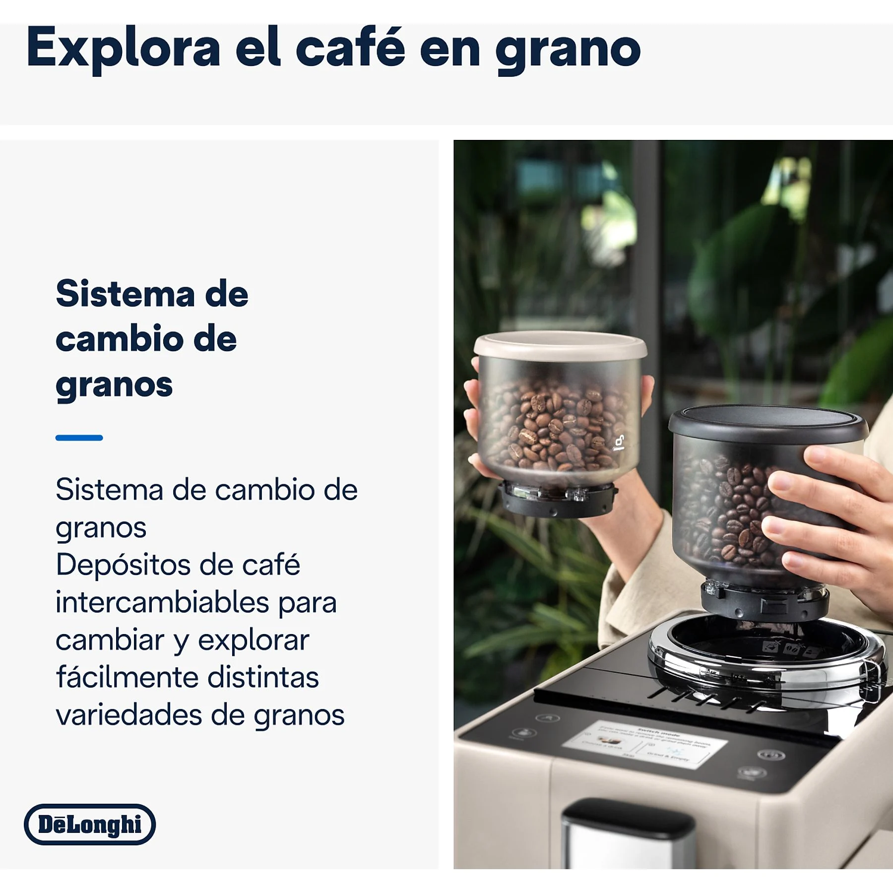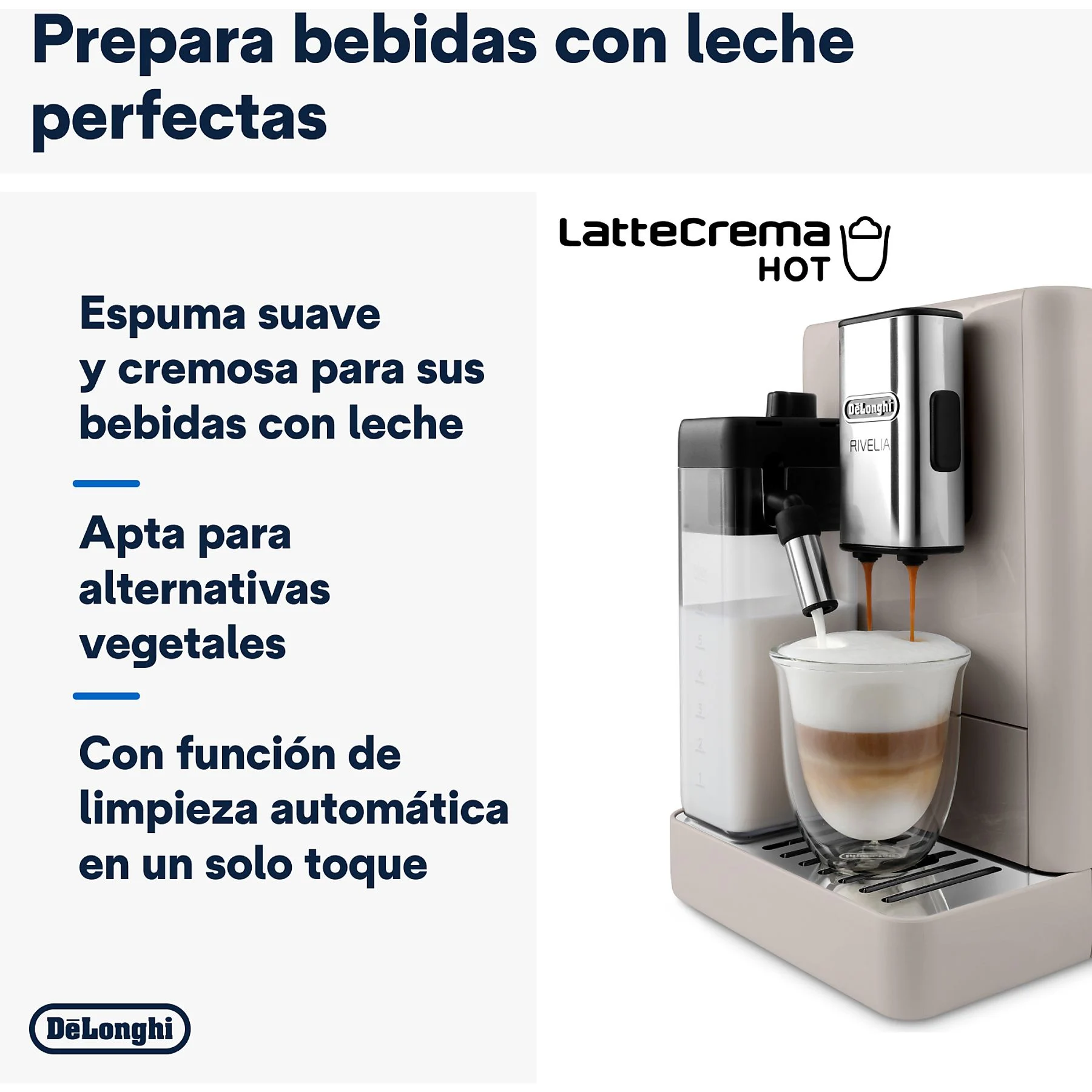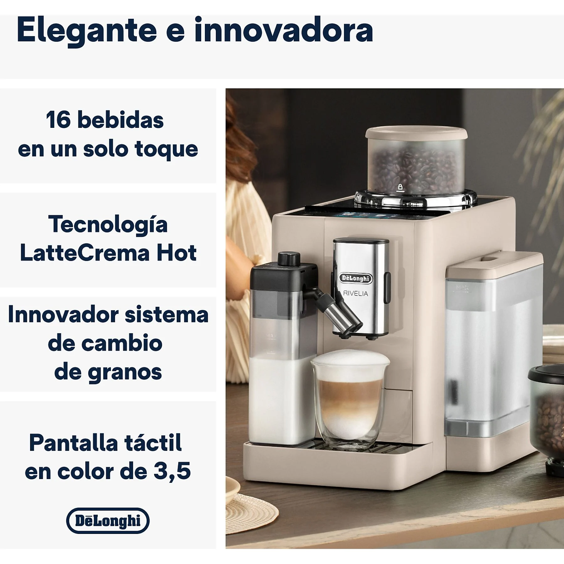 Cafetera superautomática – De’Longhi Rivelia EXAM440.55.BG, 1450W, 19bar, Molinillo integrado,LatteCremaHot, Depósito leche, Táctil, 16 recetas, Beige