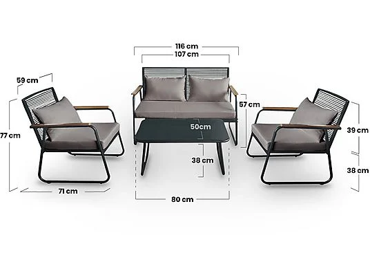 Conjunto de jardín. Contenido en caja: 1x Sofá de 2 plazas, 2x Sillones, 1x Mesa de centro, 1x Manual de instrucciones. |