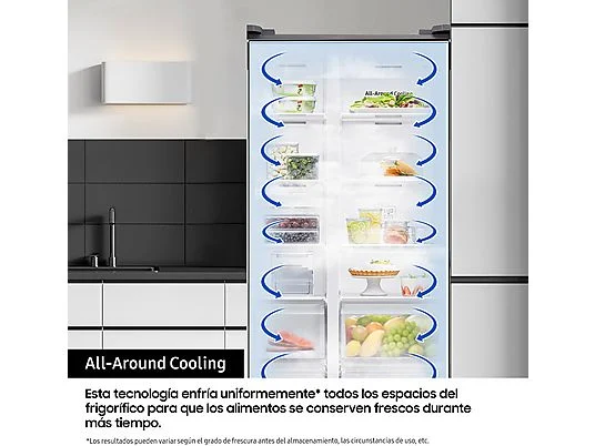 Frigorífico americano – Samsung Bespoke AI RS70F64KETEF, All Around Cooling, No Frost, 178.4 cm, 640 l, Dispensador agua y hielo, Inox