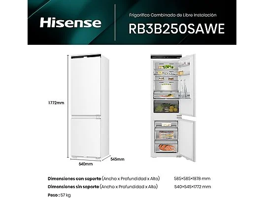 Frigorífico combi integrable – Hisense RB3B250SAWE, No Frost, 177.2 cm, 252 l, WiFi, Motor Inverter, Sin Panelar
