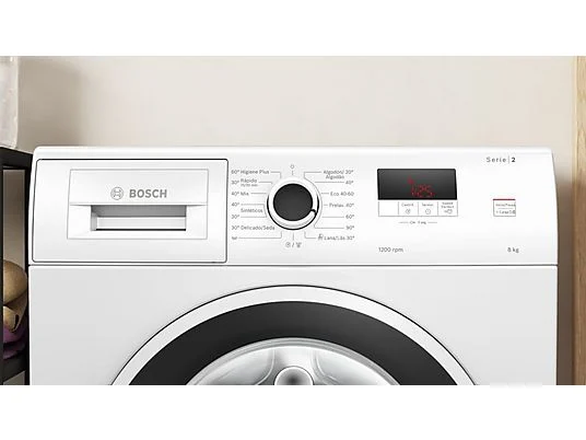 Lavadora carga frontal – Bosch WGE03200ES,Serie 2, 8 kg, 1.200 rpm, 13 programas, Higiene Plus, Motor EcoSilence, Blanco