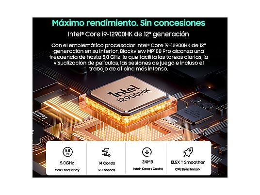 Mini PC - BLACKVIEW MP100 Pro-i9-12900HK, Intel®Alder Lake i9-12900HK (Hasta 5.0GHz), 16 GB RAM, 512 GB SSD, UHD Graphics, Windows 11 Pro, Negra