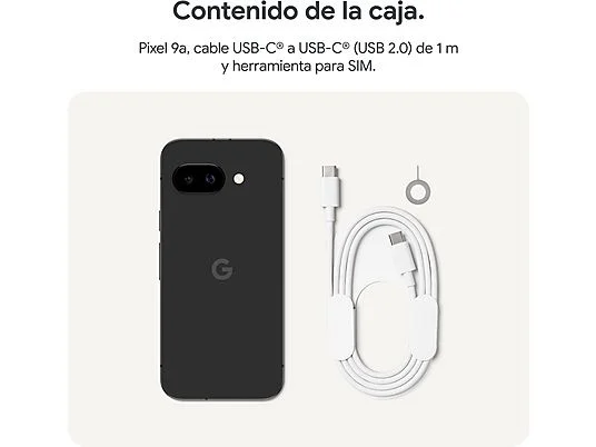 1x Google Pixel 9a, 1x cable USB-C a USB-C, 1x herramienta para SIM |