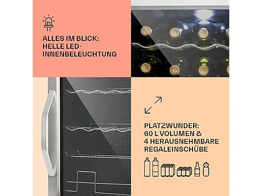 1 x nevera para bebidas, 1 x estante, 2 x botellero (en forma de onda), 1 x estantería de champán, Manual de instrucciones multilingüe, |