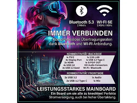 4x DisplayPort, 2x HDMI, 4x USB 3.2 Gen 1, 5x USB 3.2 Gen 2, 1x USB 3.2 Type-C, 1x LAN, 1x Audio, 1x Mikrofon |