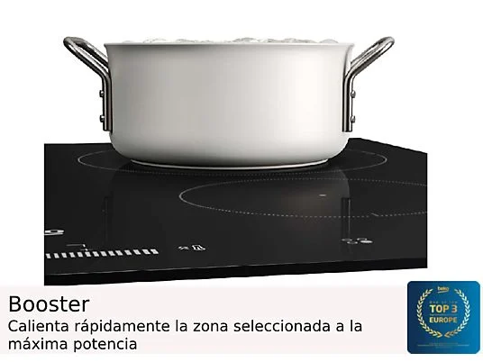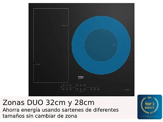 Placa inducción – Beko HIIS63206M, 3 zonas, Zona grande 28 cm, Temporizador, 60 cm, Negro