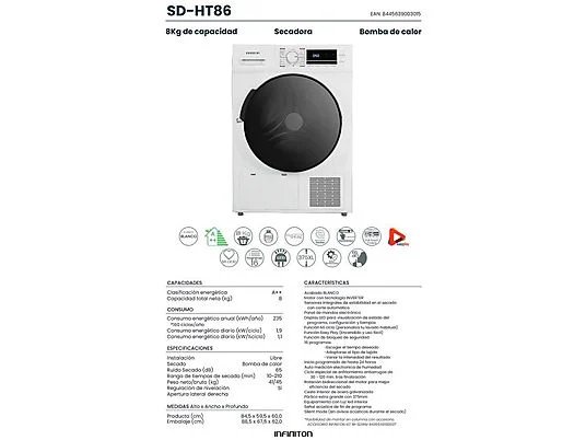 Secadora bomba de calor – INFINITON SD-HT86, Eléctrico, 8 kg, 16 programas, Blanco